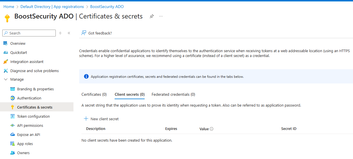 This guide provides detailed instructions for configuring Microsoft Entra ID and Azure DevOps (ADO) to integrate with BoostSecurity. The configuration establishes a secure connection using an Entra ID app registration, service principal, and associated permissions. By following the steps outlined in this guide, you will: