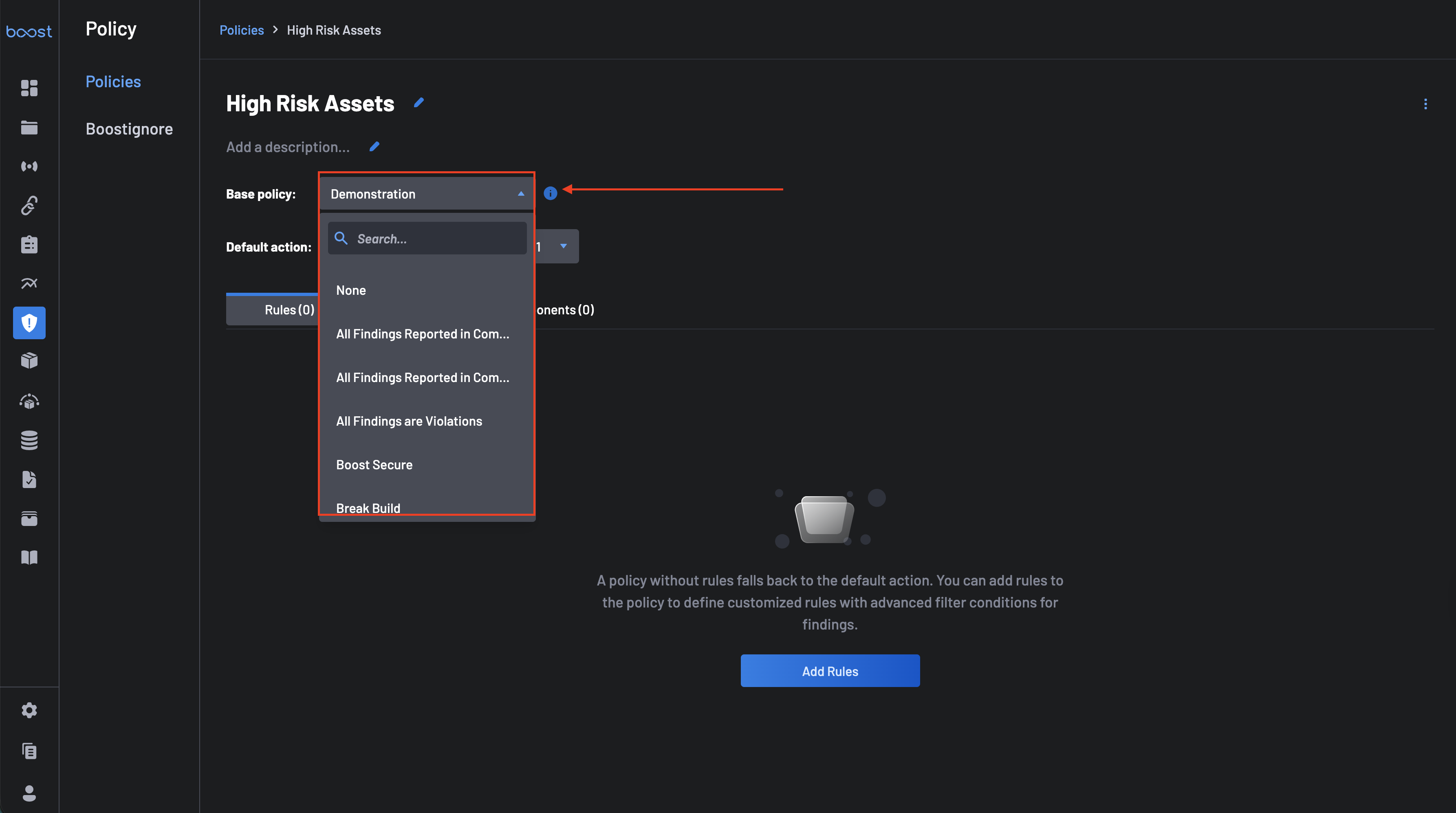 (Optional) In the Base policy dropdown, select a parent policy to inherit rules, scanners, and components from.